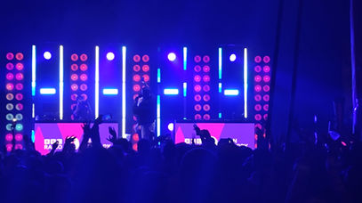 The screen design featured five LED totems behind the artist with light bars in between them. To compliment the design I decided to mask branded content through a pre made clip of a bulb array.